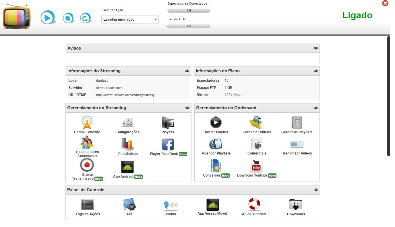 Conte com um painel de controle poderoso, com recursos completos para sua Web Tv. Nosso painel é prórpio e dispomos de 3 linguagens: Português, Inglês e Espanhol.
